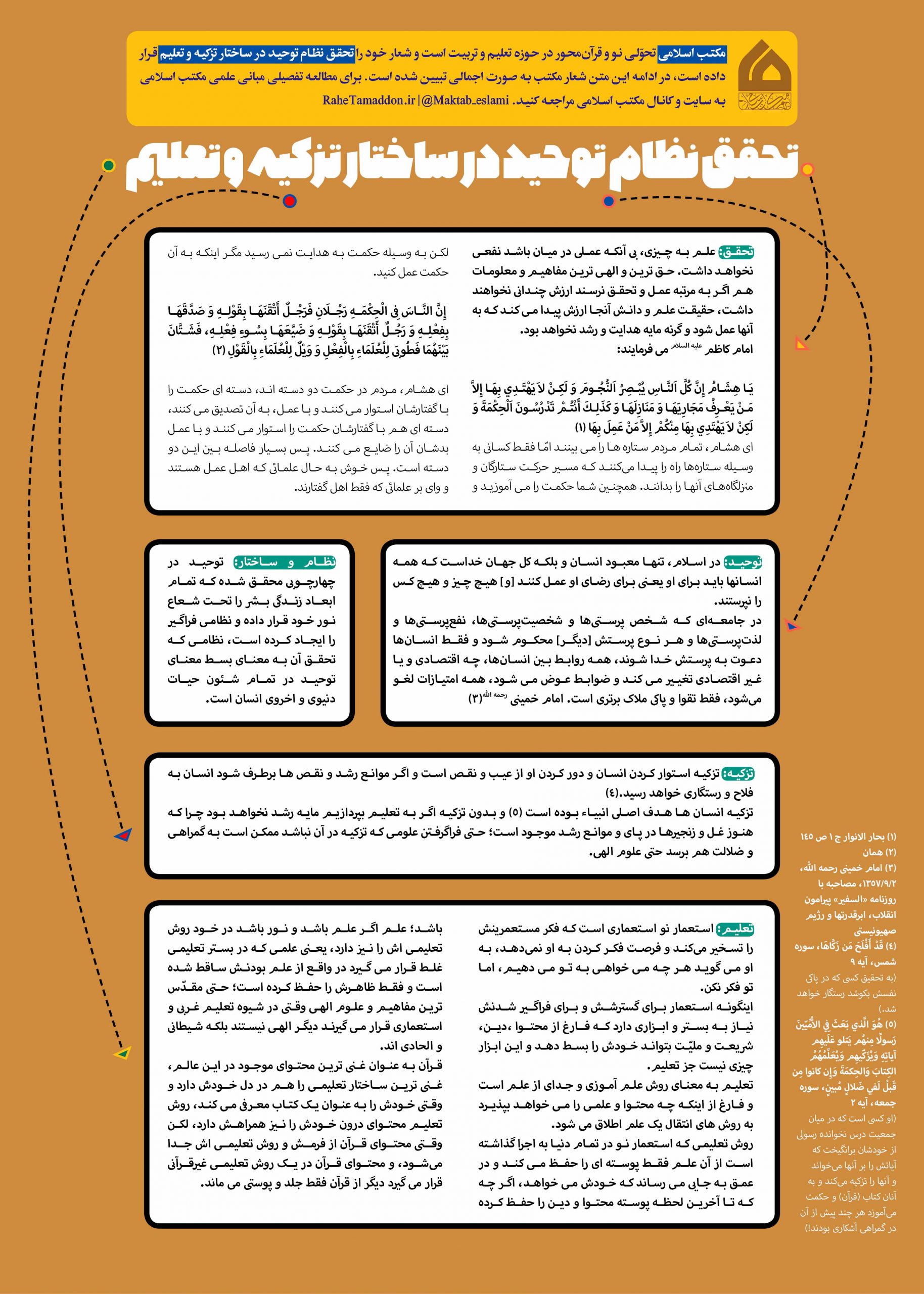 مکتب اسلامی تحوّلی نو و قرآنمحور در حوزه تعلیم و تربیت است و شعار خود را تحقق نظام توحید در ساختار تزکیه و تعلیم قرار داده است که در ادامه، شعار مکتب به صورت اجمالی و مختصر تبیین شده است.